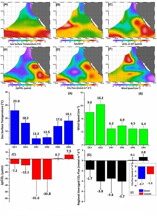 The Northeast Pacific coastal ocean, as a typical river-influenced coastal upwelling system, is characterized by significant variability of sea surface partial pressure of carbon dioxide (pCO2, <200 to >1000 μatm). This study reviewed the pCO2 variability and its underlying controlling mechanism in this highly dynamic region by bringing together previous scientific findings and historical data. The large pCO2 variability reflects the complex interactions between physical processes (riverine input and coastal upwelling) and the biological responses to the nutrient transportation associated with these physical processes, while temperature and air-sea gas exchange play a minor role in affecting pCO2. Both the river water and upwelled subsurface water are characterized by higher concentrations of pCO2 and nutrients when compared to the coastal surface water. The presence of high chlorophyll-a and low pCO2 in river plumes and areas adjacent to upwelling locations showed the intense biological CO2 uptake. The influences of riverine input and coastal upwelling thus mainly depend on the competing effect of high background pCO2 of river water and upwelled subsurface water vs. the biological dropdown of pCO2 resulting from the riverine- and upwelling-associated nutrient supplies. The strength of upwelling-favorable wind plays an important role in the pCO2 variability by affecting the intensity of coastal upwelling, with stronger wind speed causing more intense upwelling. The long-term pCO2 increasing rate in the Northeast Pacific coast is observed to be lower than that in the North Pacific open ocean.